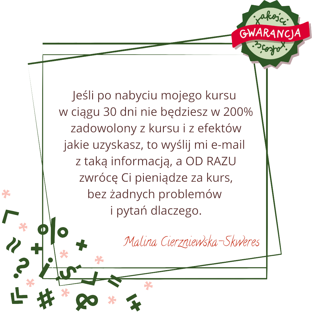 Daję Ci 30-dniową, bezwarunkową gwarancję natychmiastowego zwrotu pieniędzy, bez pytań i żalu